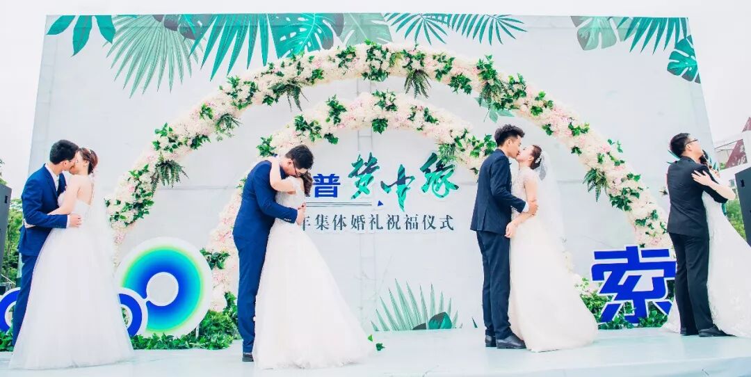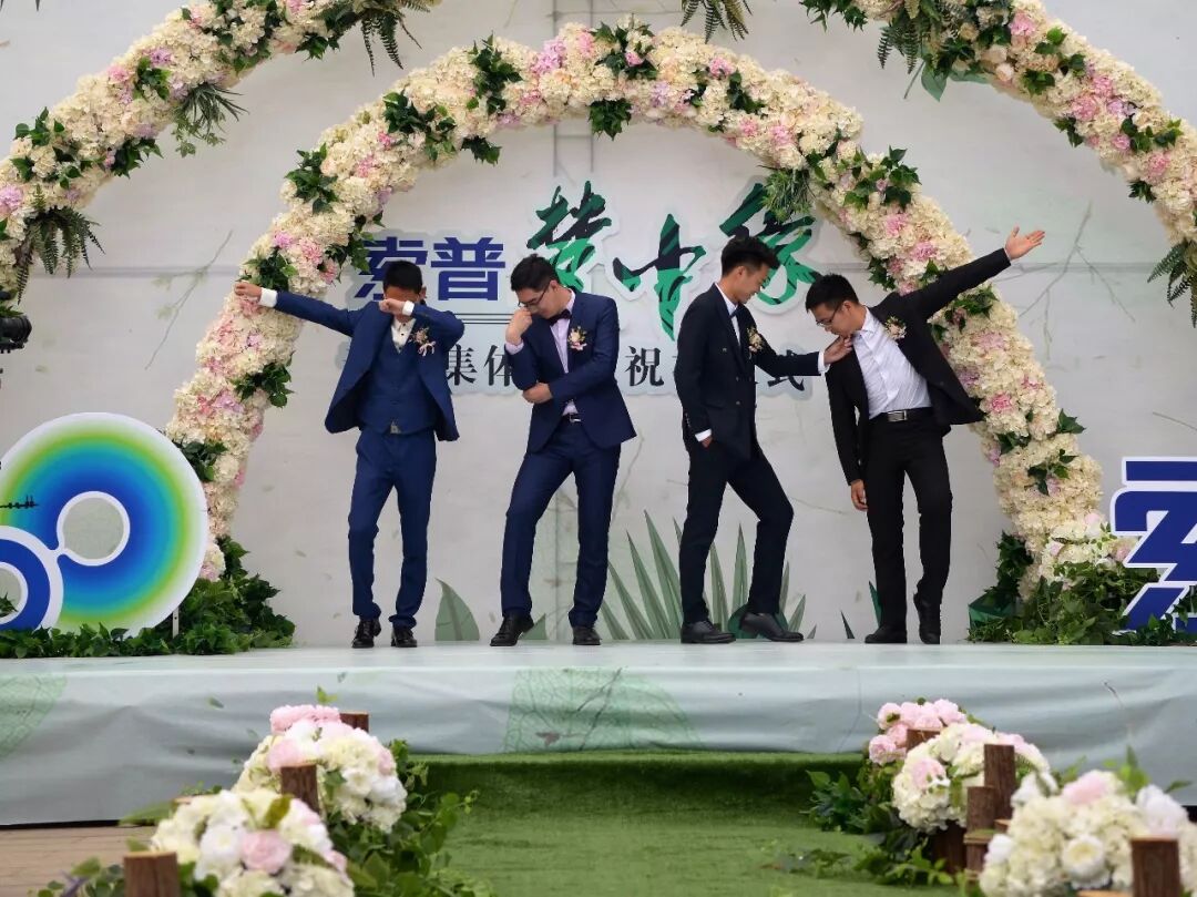 參加集體婚禮的4對新人大部分為索普集團雙職工,其中既有一線員工,也有基層管理人員。下午14點08分,集體婚禮在歡樂的音樂聲中開始,4位新郎變身“舞蹈天團”,在掌聲和祝福聲中,踏著輕快的舞步迎接自己的新娘。